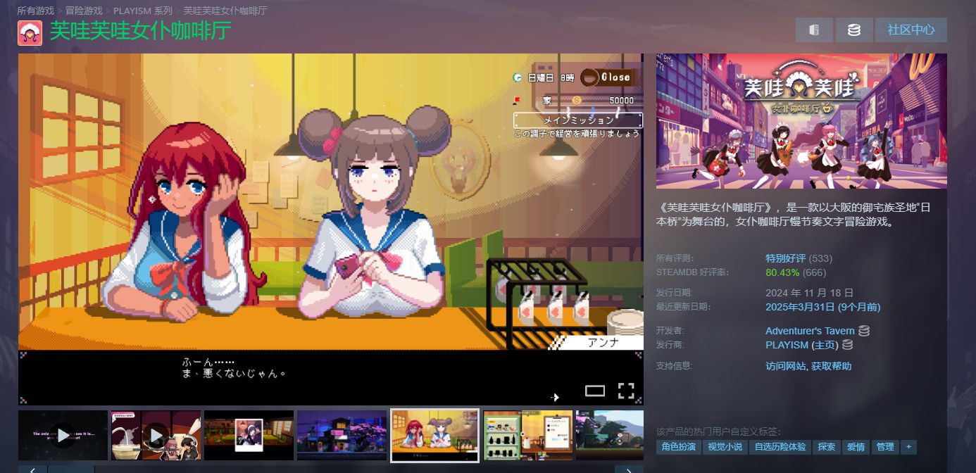 有着優秀的像素畫風與豪華的聲優陣容的日式文字冒險遊戲。在遊戲中,玩家需要扮演一名逃離黑心企業後意外成爲了女僕咖啡廳店長的前社畜,與4位可攻略女僕共同努力,拯救瀕臨倒閉的小店。