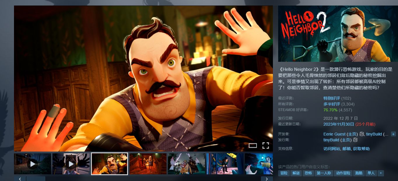 《你好,鄰居2》是潛行解謎遊戲「你好宇宙」中的第二部正傳,謎題量更大,精簡了交互內容,只保留關鍵道具,AI更加智能。