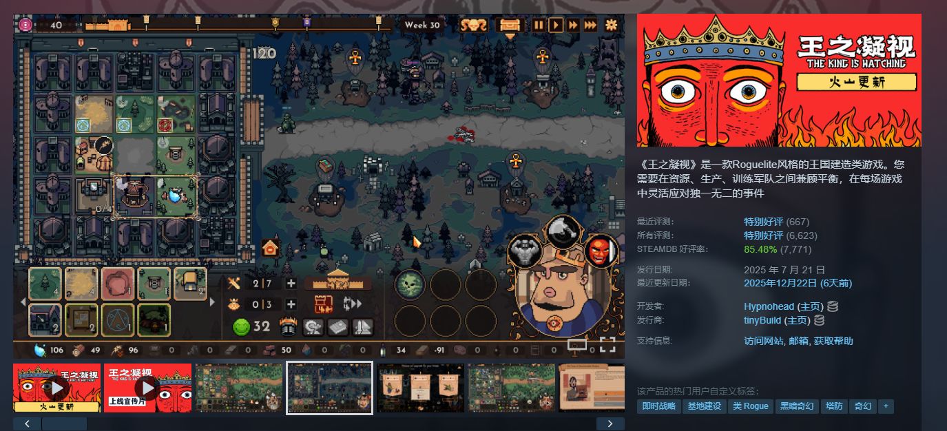 融合了建造、經營以及策略元素的肉鴿遊戲。聽名字很霸氣威武,玩起來更是個“眼神管理大師”的活兒!玩家在遊戲中扮演一位國王,你手裏的村民們是真的刁民,王國裏的農民種地、礦工挖礦、士兵訓練,全都靠你這位國王“盯着看”!