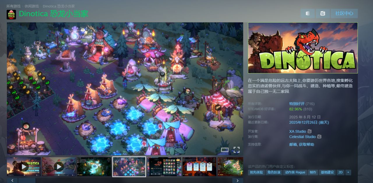 本作是一款融合了沙盒建造+種田玩法的肉鴿戰鬥遊戲。在遊戲中,玩家需要扮演慘遭遠古神獸猾褢一腳踢死後死而復生的原始人,從零開始馴養迪諾獸,並與它們一起建立起嶄新的家園