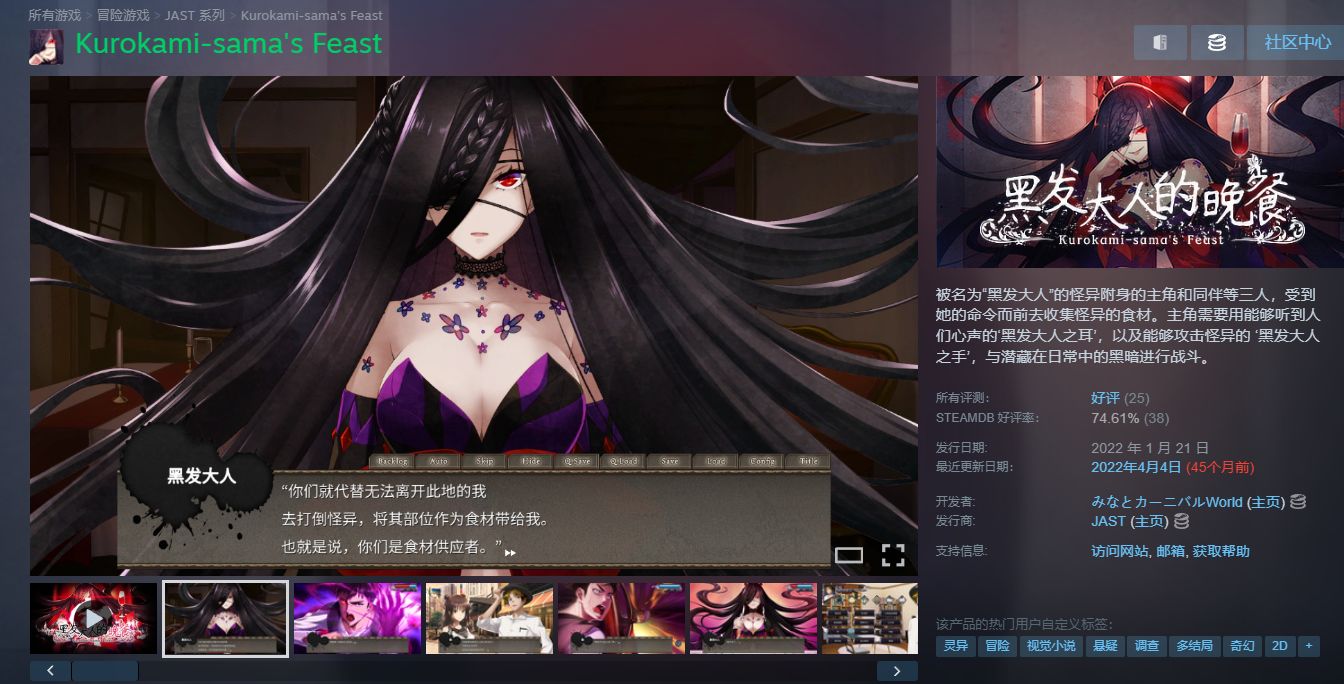 日式怪談懸疑ADV。 故事講述落魄的漫畫家主人公爲尋找靈異題材的靈感,與青梅竹馬少女以及怪異社團社長作死尋訪“黑髮大人”怪談,卻遭“黑髮大人”襲擊並威脅三人給其提供食材以供其積蓄靈力打破封印的故事。