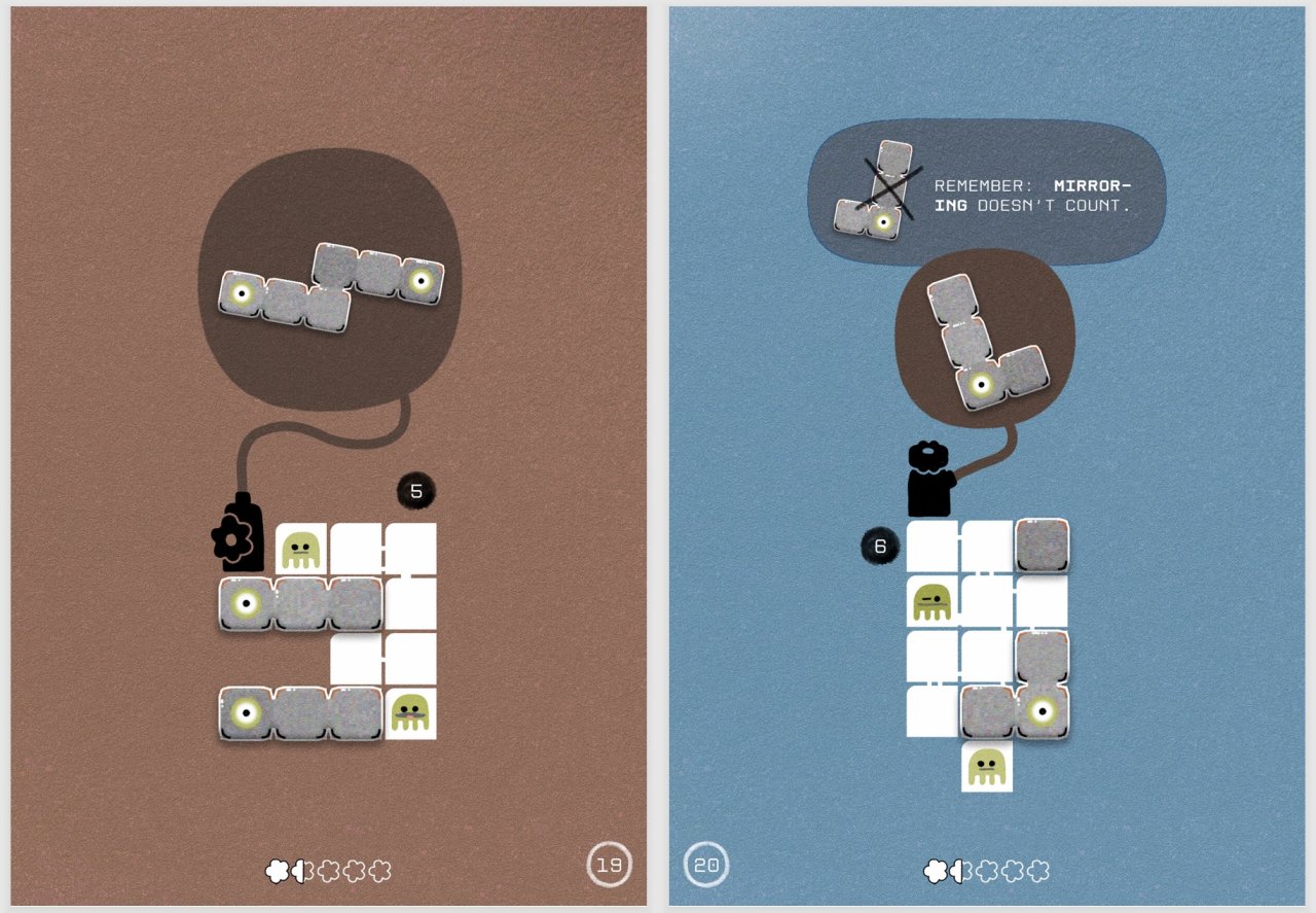 本作結合路徑繪製和“拼圖”創造了一種獨特的核心題種:玩家要在謎題中用路徑連接兩個“Worker”,然後將路徑上通過的“拼圖塊”沿着路徑連接起來,構造出指定的“輸出”。這套基礎規則由於比較獨特和複雜,因此本作直接用文字進行了詳盡解釋,而後續就算也有幾個沒有進行解釋的新規則,感覺也比較直白,不需要在多個謎題間交叉驗證就可以獲得一個比較準確的猜測。所以在這一方面,感覺確實是少了一些獨特的瞬間。