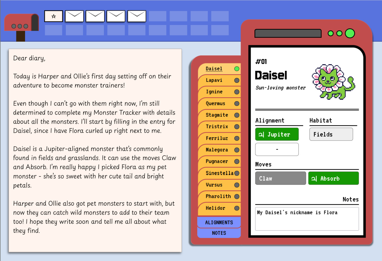 這款遊戲是一個推理解謎遊戲,設定明顯致敬“寶可夢”,只不過主角由於一些原因暫時不能和同齡人一樣帶着“怪物”出門探險,於是就只能呆在研究所裏,通過夥伴們發回來的郵件來推理出“怪物圖鑑”中的各種信息