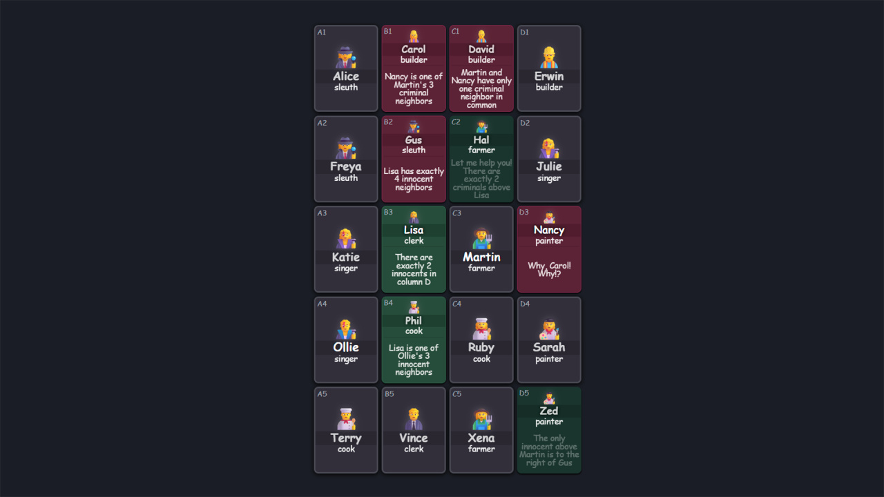 另一個邏輯解謎每日一題”網站,玩家要解決的是一種有點類似“掃雷”的邏輯謎題:每個謎題共有5行4列的“嫌疑人”,而每個嫌疑人要麼是“犯人”,要麼是“無辜者”,當玩家正確推理出一個人的身份之後,ta可能就會說出一條新的線索,具體就有很多種了,可以是“和我相鄰的人裏至少有1個犯人”,或者“Nancy是犯人”等等。同時,遊戲還要求每一步必須是邏輯上可推的,如果你試圖猜測現在還不能推理的身份,會導致“錯誤”,這點如果玩過《14種掃雷變體》的“專家模式”(防猜模式)的話應該很好理解。