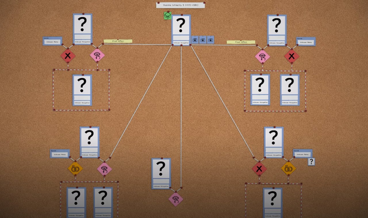 顯然,這部分內容選擇關注於“挖掘醜聞/祕密”這一點,不僅會使得敘事上會多一些波瀾,而且也因爲要挖掘的是更深層次的祕密,所以各方面難度(檢索、推理)也比本篇高上不少,就連最開始的幾個身份和職業都有非常多的干擾項。我個人玩到後面是有點懵了,只能靠提示來找到漏掉的線索。