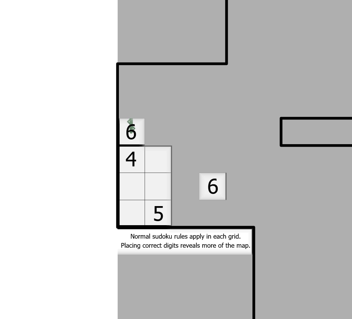 本作的設計離不開“迷霧數獨”(Fog of War Sudoku)的概念。在迷霧數獨中,玩家一開始不能看到完整的盤面以及其中的線索,而只有在正確填入一部分數字之後,迷霧纔會慢慢揭開。雖然你可以說這種設計讓謎題脫離了純粹的“紙筆謎題”範疇,但不得不承認這是數獨界的一個偉大發明,它把類似“掃雷”的交互過程和紙筆謎題聯繫在了一起,產生了非常多奇妙的作用,比如進度控制引導