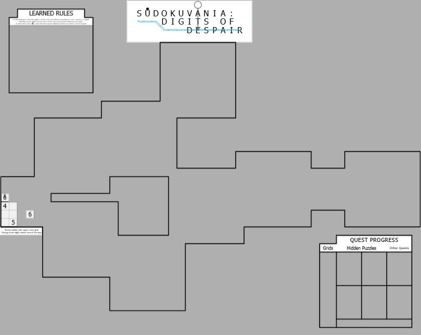 這是一款參考“類銀河城”(Metroidvania)遊戲理念設計的變體數獨謎題集,包含一系列20多個變體數獨,不僅有上面圖片中能看到的“Overworld”,由10幾個數獨連接而成,還存在單獨的“BOSS謎題”,需要解開特定主題的孤立數獨。