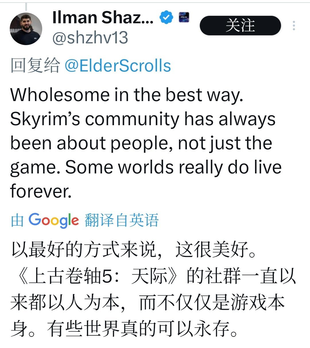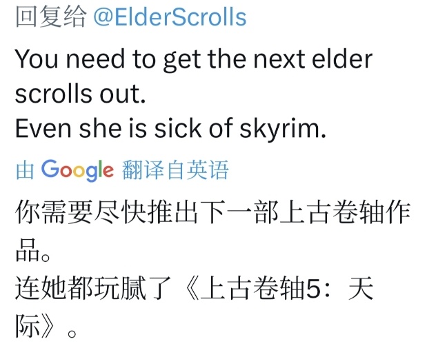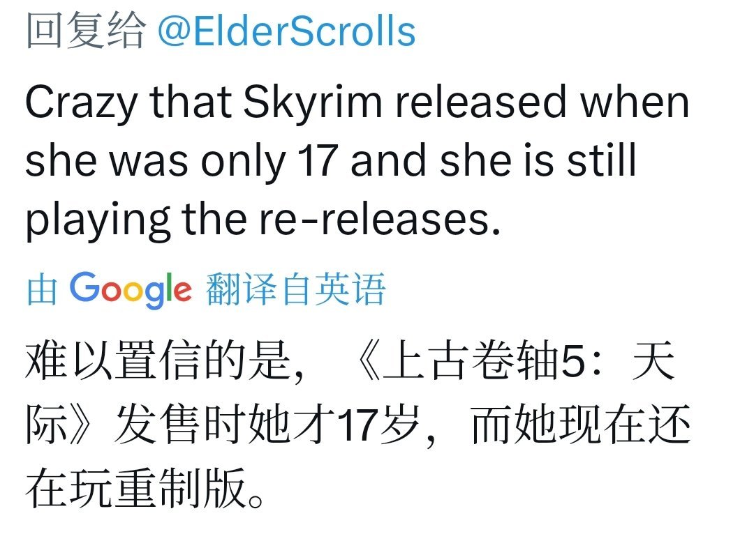 “看到天际老奶奶状态很好就放心了,她的声音听起来那么有活力!”“真希望能在《上古卷轴6》里看到她!B社快点行动吧。”等ES6出来时我都和奶奶一样老了,我现在才30岁。