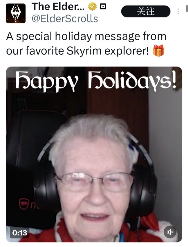 在2025年12月24日晚上,《上古卷轴》官方X账号发布了一条帖子,内容为:附带一段视频,时长约16秒。视频主角正是Shirley Curry,她戴着圣诞帽,穿着红色毛衣和彩色围巾,坐在游戏椅上,背景是她的家居环境。视频开头,Shirley多次重复“Happy Holidays!”,屏幕上叠加了金色发光的文字效果,营造出节日氛围。随后,她说:我想祝大家节日快乐,并尽情享受玩《天际》的乐趣。