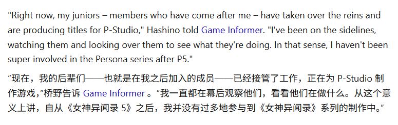 "目前由我的後輩們接手P-STUDIO並負責項目開發,"橋野向Game Informer表示,"我處於旁觀位置,關注他們的工作進展。因此P5之後我未深度參與系列開發。"但他強調兩家工作室同處Atlus辦公樓層,與《真·女神轉生》《女神異聞錄》開發團隊保持環境互通:"即使間接地,觀察公司內部其他工作室的動態也能帶來啓發。從創作角度我們並未完全割裂,請各位放心。當然現階段無法透露具體計劃,但彼此確實存在互動。"