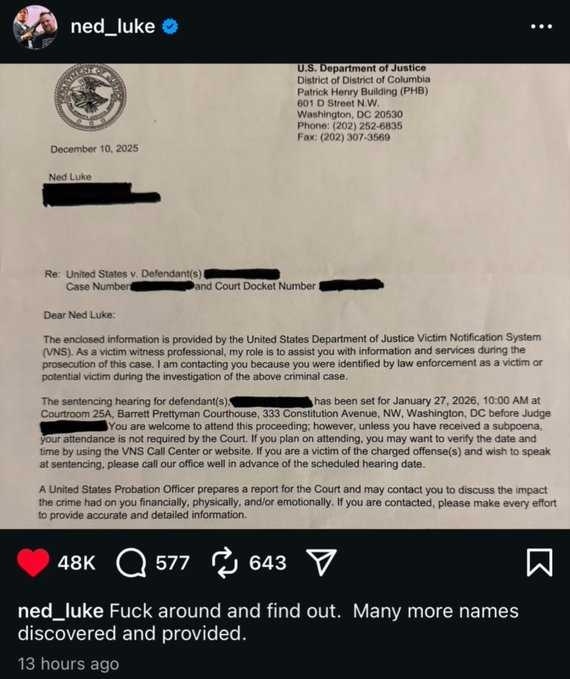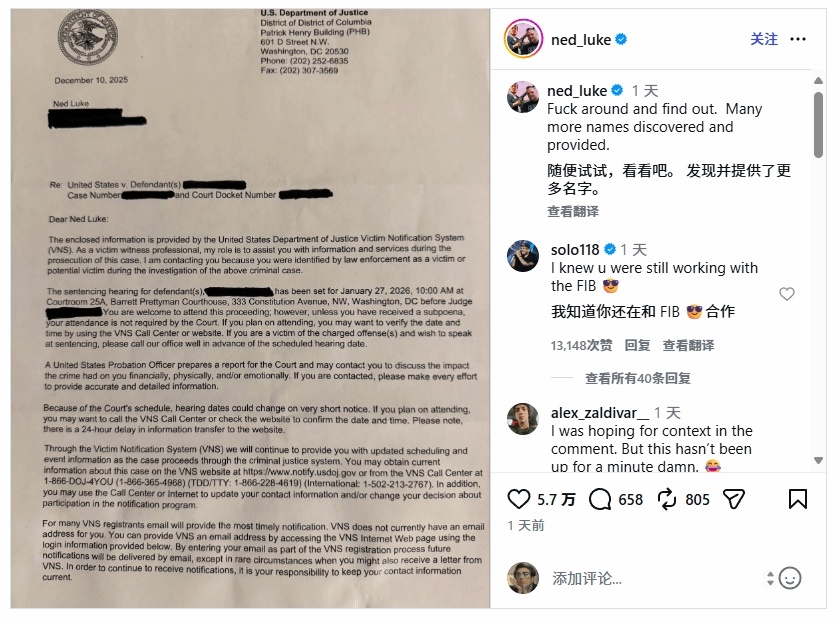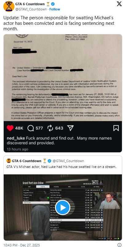 曾为《给他爱5》主角麦克·迪圣塔配音的演员内德·卢克,在遭遇恶意“报假警”骚扰两年后,终于迎来正义结果。本周他在社交媒体公布了美国司法部的案件通知,确认一名涉案人员已被定罪,并将于2026年1月27日接受量刑听证。