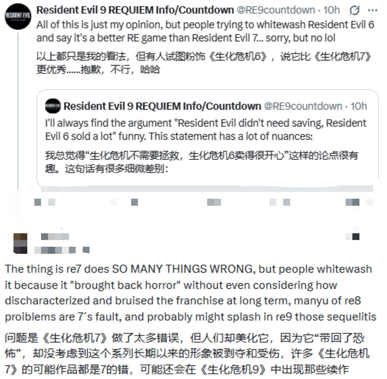 12月28日,知名游戏爆料人针对玩家社区内“生化6 vs 生化7,谁表现更差”的讨论发表长文评论。尽管他个人对《生化危机6》有所喜爱,但仍明确指出其诸多设计缺陷。