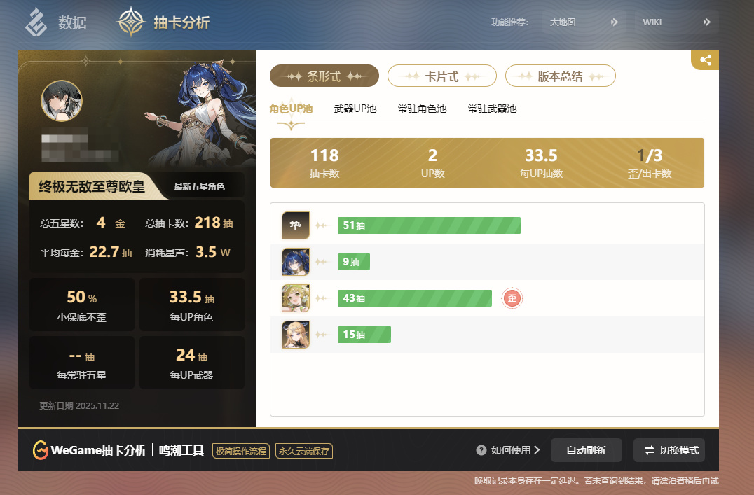 再說WeGame端不僅福利多多,遊戲適配方面也是真刀實幹,先是主頁直接就能查看當前體力數據實時查看情況,再加角色數據卡隨時遊戲外查看養成狀態,再來個大的騰子直接把琳奈莫寧倆老婆塞進客戶端首頁,點進來就是動起來的辣妹和果凍大腿好好好~還有作爲全網唯一PC端官方抽卡工具的含金量——極簡操作流程,遊戲內一鍵刷新抽卡分析結果,數據獲取快捷方便,隨時更新還是雲端存儲,分版本的抽卡總結還能一鍵保存方便隨時炫耀哦~