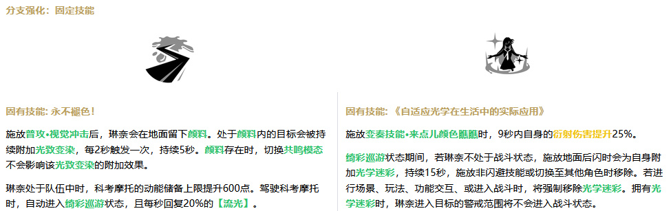 固有技能1釋放強化普攻後留下燃料一直給敵人疊debuff,還能給咱們摩托增加動能儲量,固有技能2變奏後提升25%衍射傷害,還給琳奈自帶一個隱身,隱身狀態不會觸發敵人警戒,似乎觀骸區有了新的玩具耶。