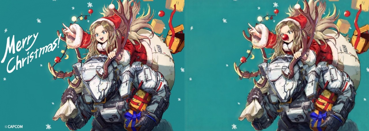 ↓↓↓ 左:游戏PRAGMATA圣诞贺图原图 右:X一键AI编辑后,去除文字和水印,戴上小丑鼻的戴安娜 。