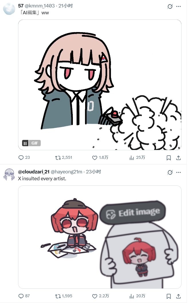 目前关于X(推特)【图片一键AI编辑功能】的讨论和抗议仍在持续。