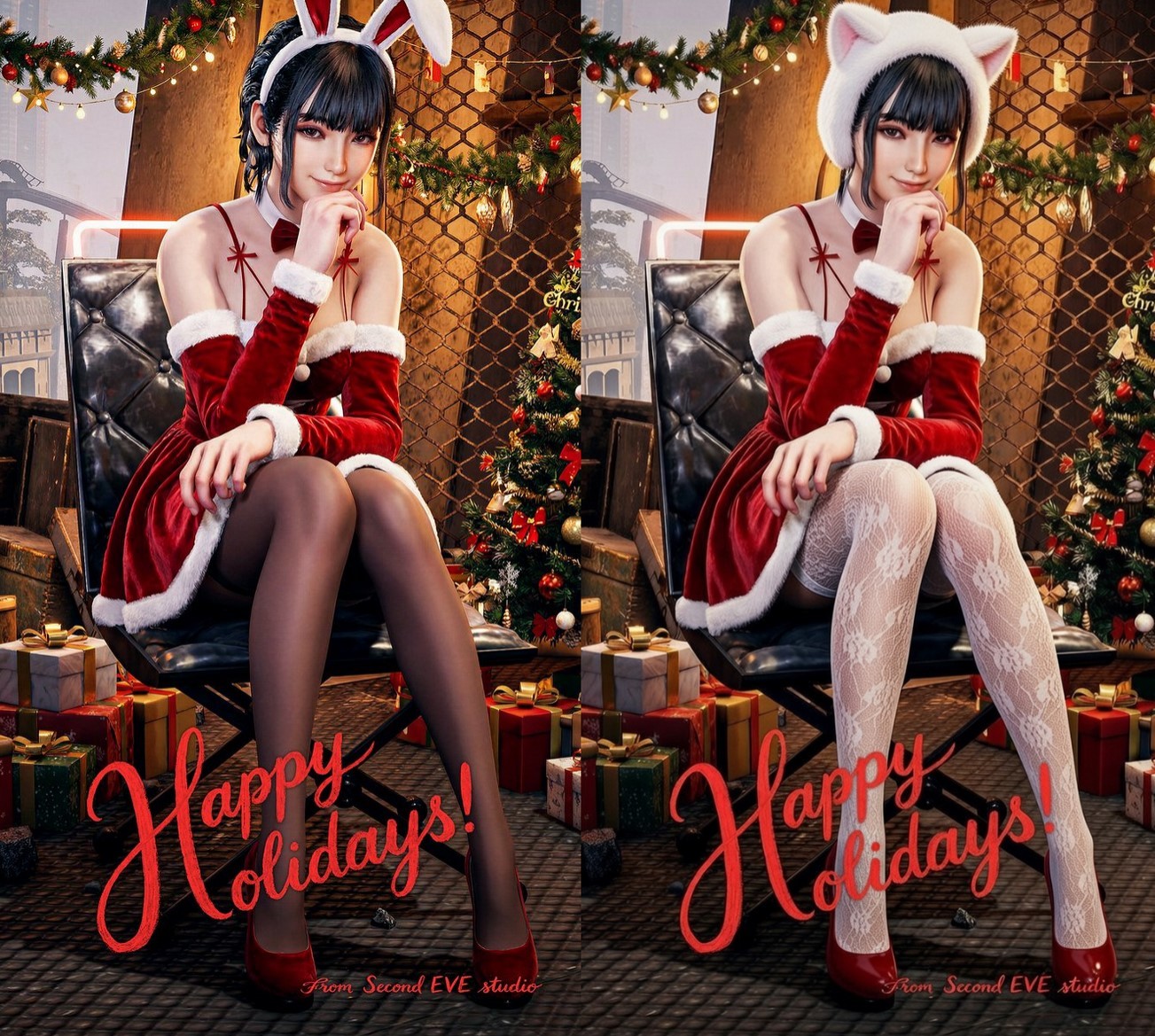 ↓↓↓ 剑星官方发布的圣诞贺图,左:原图,右:X一键AI编辑,修改帽子和服饰后的伊芙。