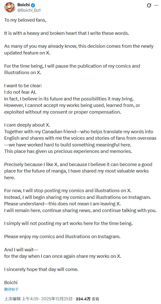 【Boichi】自24日发布推文表达对AI一键编辑的不满后,后面又发布了几篇推文。