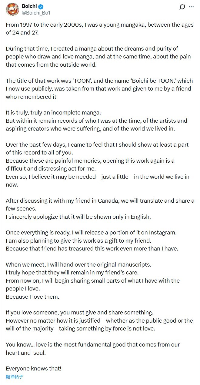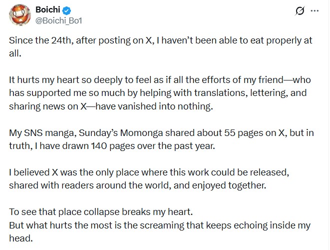 在X上,我依然会像之前那样发布近况、与大家交流,这次的决定只是为了管控作品的公开渠道。还请大家在Instagram上继续享受我的漫画与插画。