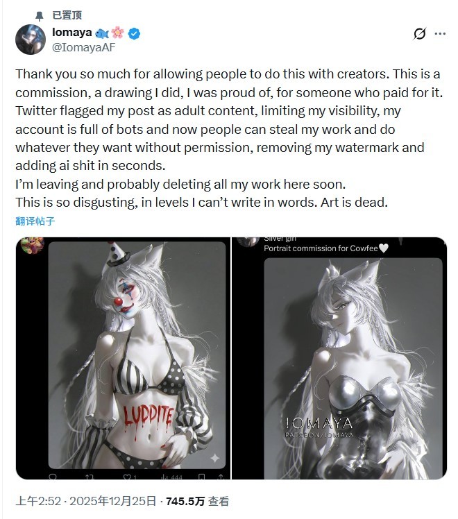 ↓↓↓ 画师【Iomaya】,在X 一键AI编辑功能上线后,发声抵制,表示自己将离开X,转战Instagram平台,X上的作品会慢慢删除。