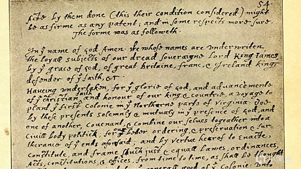 以上帝的名义,阿门。吾等签约之人,……因此在上帝面前共同庄严立誓签约,自愿结为一公民团体。为使上述目的得以顺利进行、维持并发展,亦为将来能随时制定和实施有益于本殖民地总体利益的一应公正和平等法律、法规、条令、宪章与公职,吾等全体保证遵守与服从。