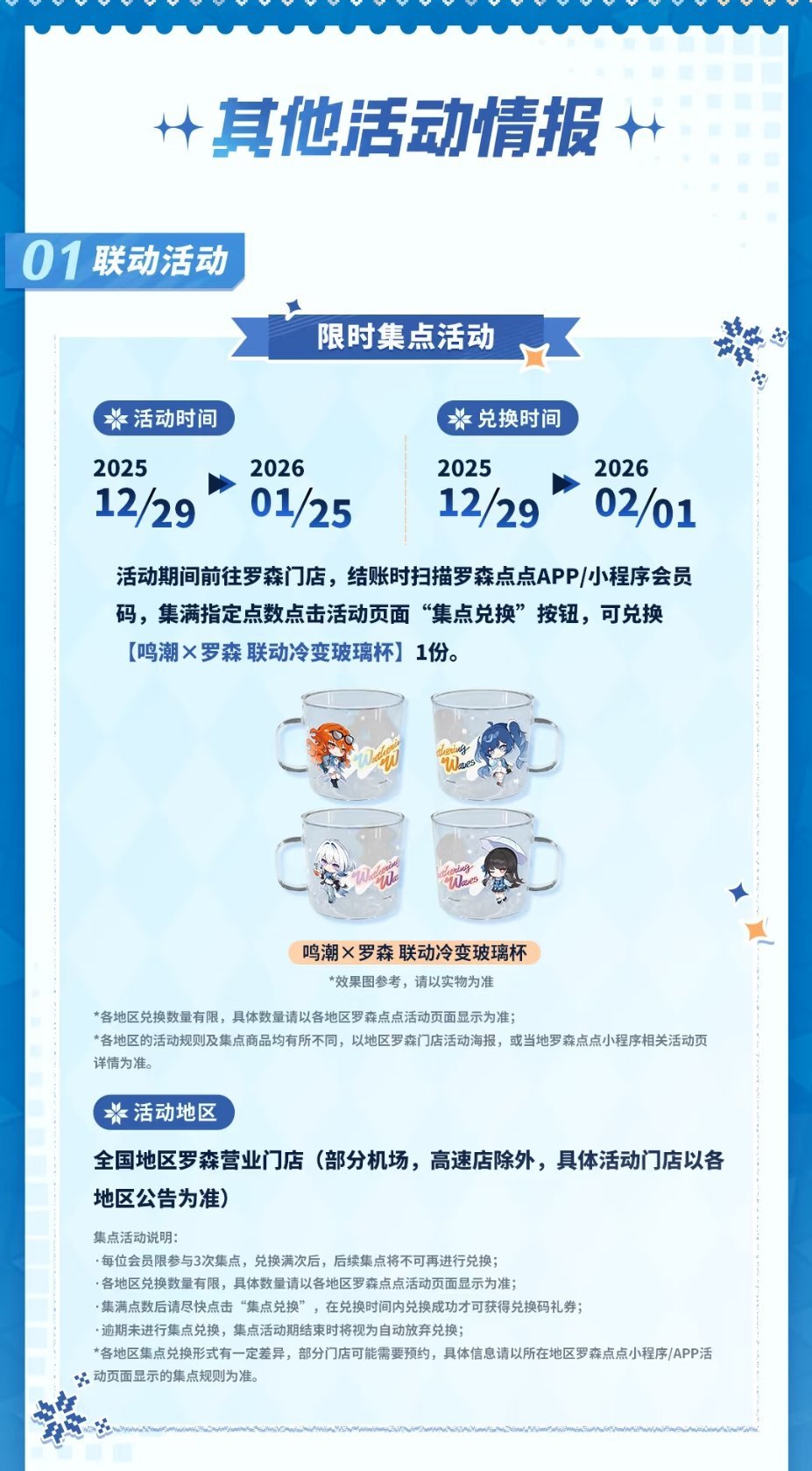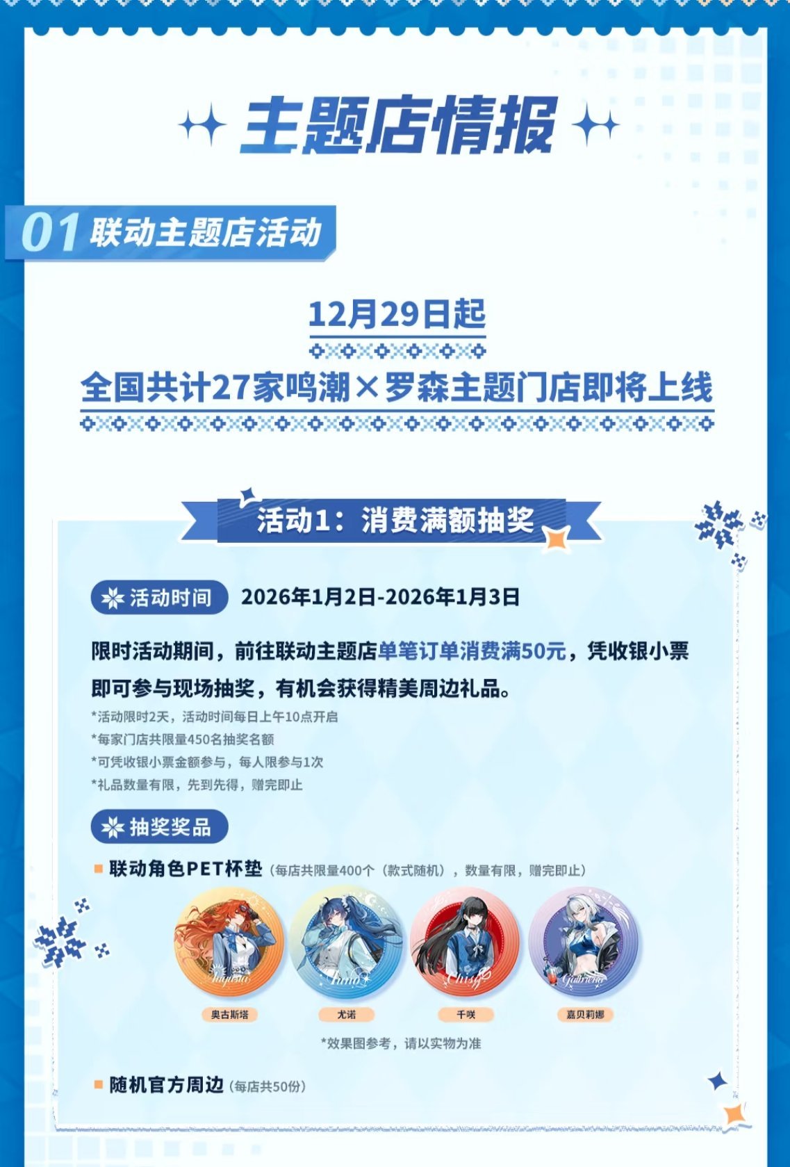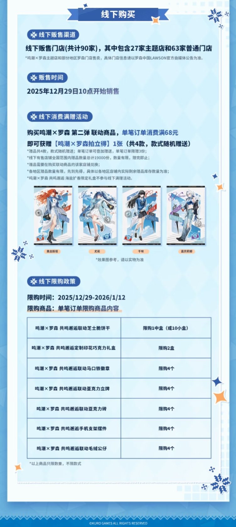 2025年12月29日起各地区主题店将陆续开启,全国27家鸣潮×罗森主题门店将正式上线,欢迎各位漂泊者到店打卡!