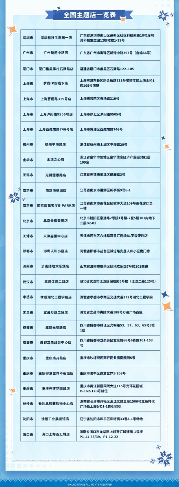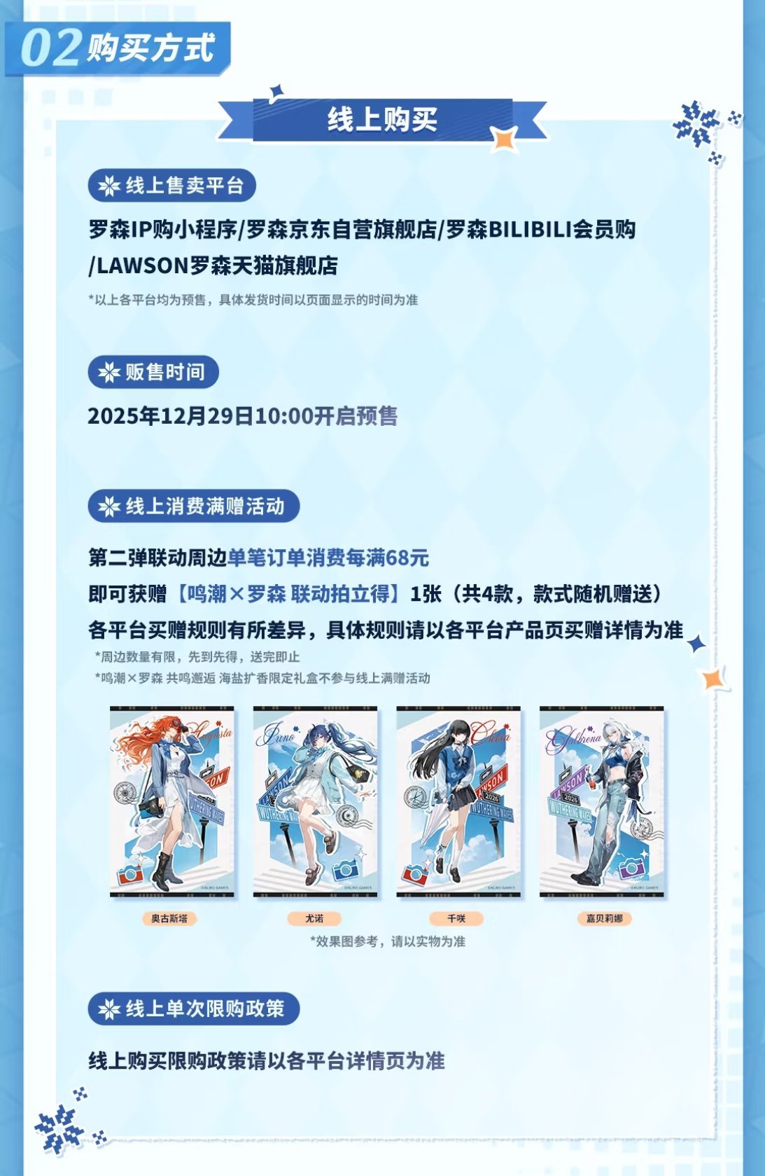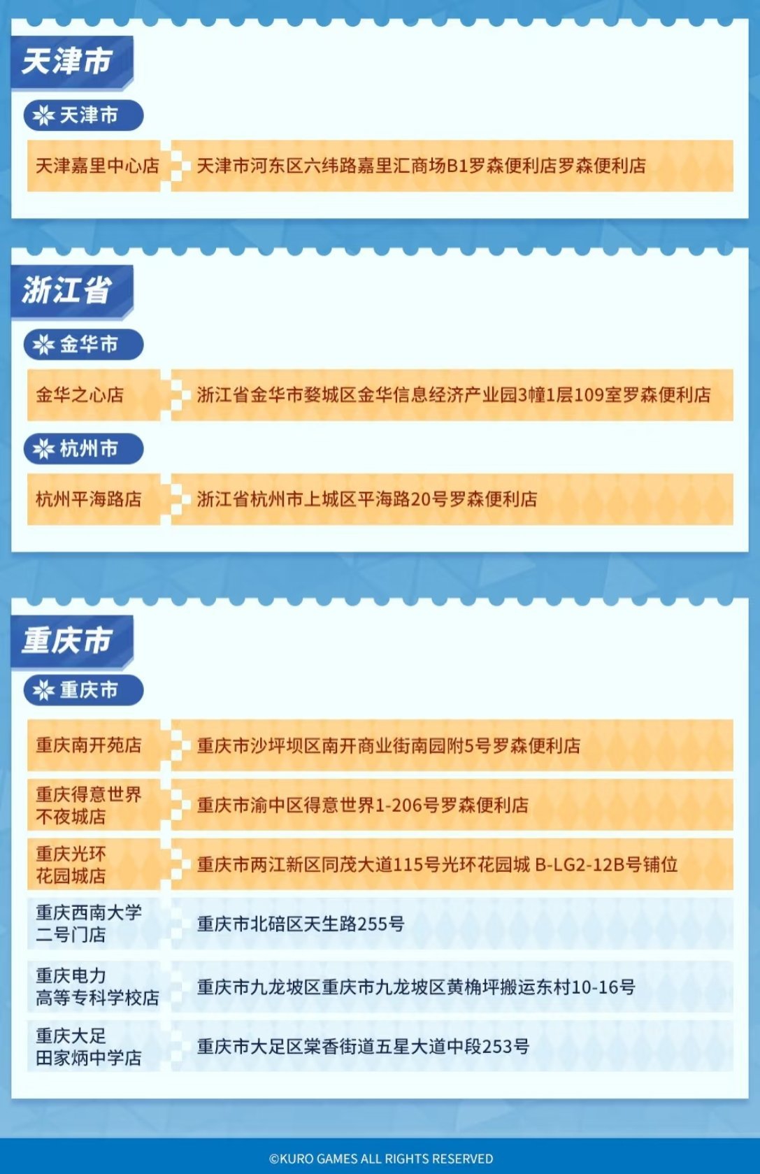 2025年12月29日起各地区主题店将陆续开启,全国27家鸣潮×罗森主题门店将正式上线,欢迎各位漂泊者到店打卡!