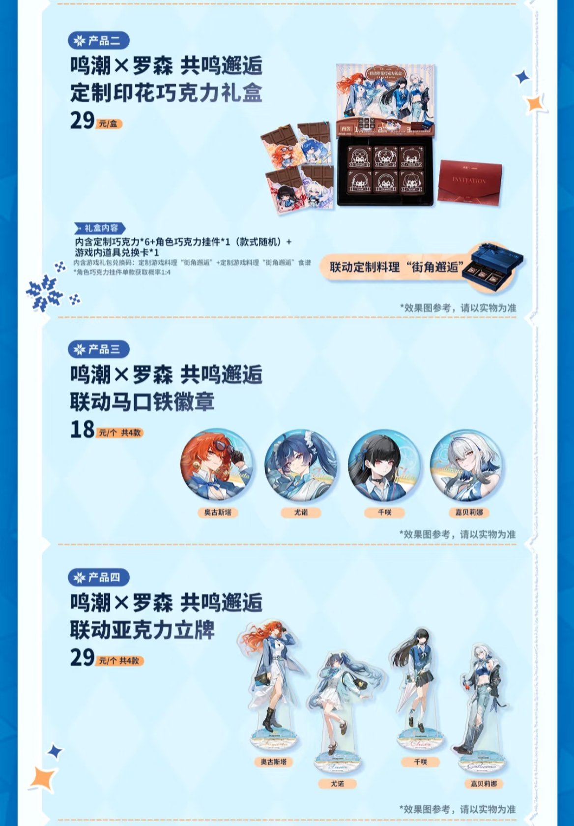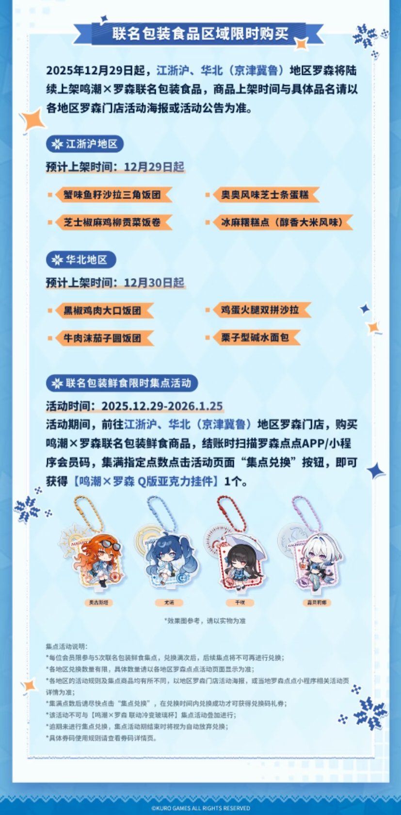 前往江浙沪、华北(京津冀鲁)地区罗森门店,购买鸣潮×罗森联名包装鲜食商品,结账时扫描罗森点点小程序会员码,集满指定点数后,点击活动页面“集点兑换”按钮,可获得【鸣潮×罗森 Q版亚克力挂件】1个。