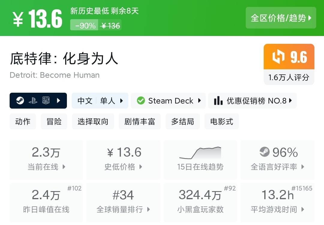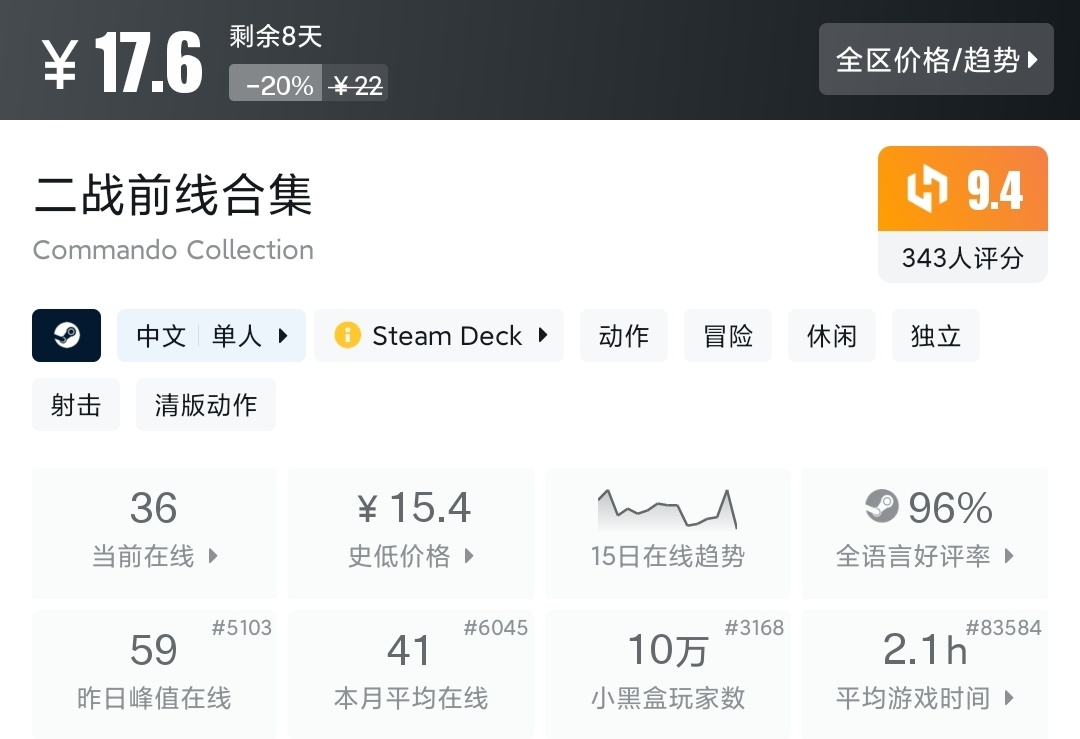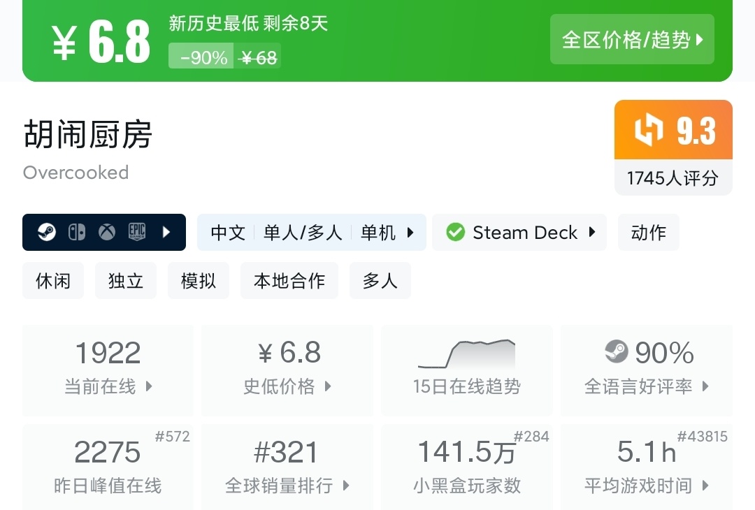 雖不是史低,但steam有四人包54元。算下來13.5,比史低還便宜5塊。