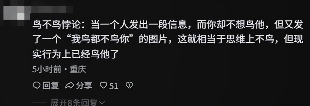 當然,此時你也得小心一點,要是再細一琢磨,我的思維控制身體發了圖片,那行爲上不還是成了“鳥他”嗎?既鳥他又不鳥他……壞了,鳥不鳥悖論出現了,羅素看了都要直呼內行了。
