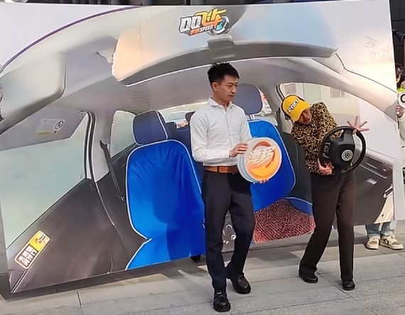 還有舉着駕駛室的牌子邊走邊打方向盤: