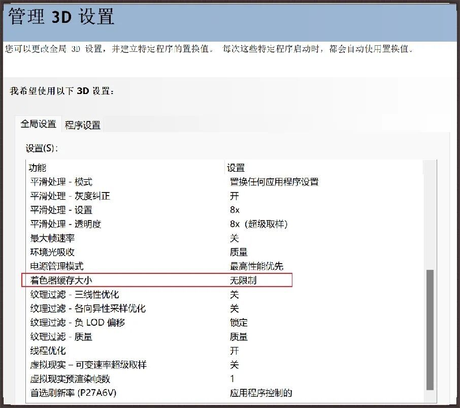另外,我记得NVIDIA 控制面板里也有一个“着色器缓存大小”设置,默认通常只有512MB(放C盘上的),导致了很多动态编译的游戏切换时会抢占空间。