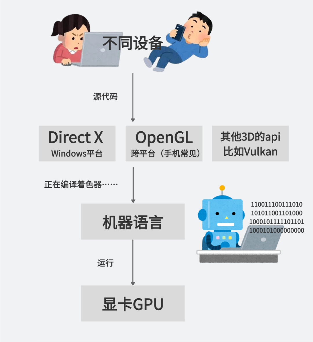 ——将程序员编写的代码,翻译成机器能看懂的二进制指令(0和1)的这个过程,就叫作“编译着色器”。网上解释的视频很多,感兴趣可以搜一搜。
