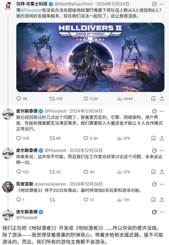 Arrowhead Game Studios首席創意官Johan Pilestedt近日明確表示,團隊目前全力投入《絕地潛兵2》的內容拓展,暫無開發《絕地潛兵3》的計劃。這一戰略旨在將現有遊戲通過重大更新逐步升級至“續作級別”。