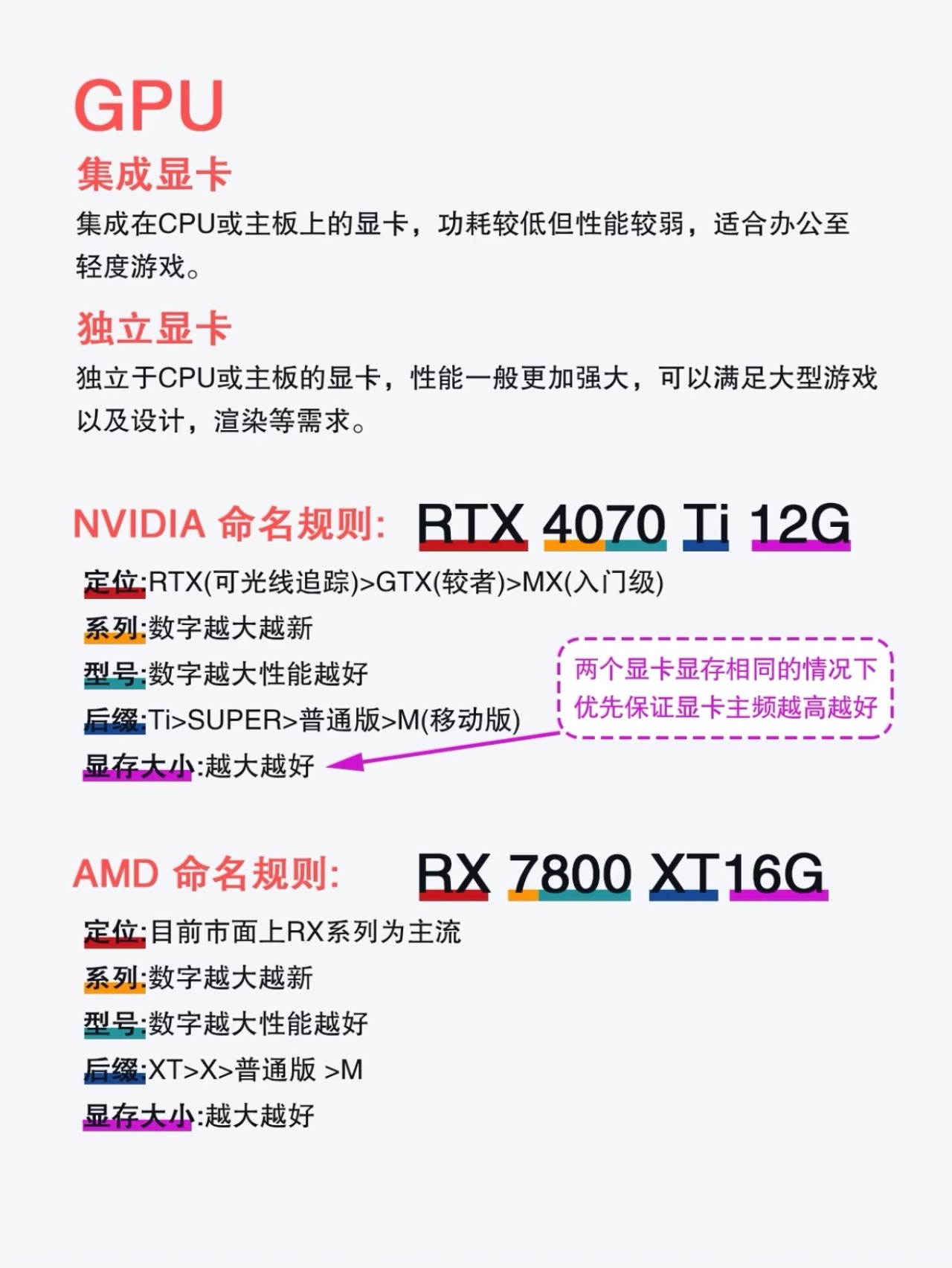 【後綴】不帶後綴爲標準版;3D=專遊戲優化;X=高性能,U=低電壓,H=高性能移動版 對比不同型號時請結合系列,代數,性能級別,和後綴來綜合判斷 顯卡- 分爲集成顯卡和獨立顯卡