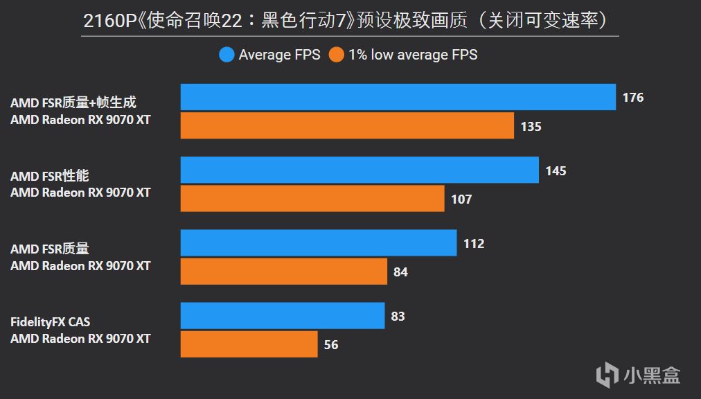 《使命召喚22:黑色行動7》本身遊戲優化就很不錯,FidelityFX CAS+AA方案下,9070 XT平均幀率已經能達到83fps,使用FSR超分辨率提升35%達到112fps高幀,疊加基於機器學習的幀生成最終達成176fps實現翻倍效果,當然,針對4K分辨率FSR性能檔也是不錯的選擇。