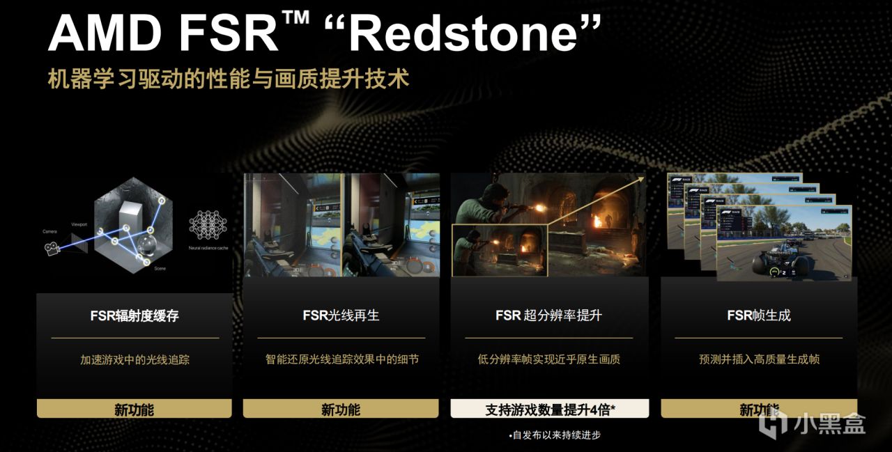 最新的FSR Redstone則是一套更完整的方案,擁有四大核心技術——FSR輻射度緩存、FSR光線再生、FSR超分辨率提升以及FSR幀生成,它們的共通點就是完全基於機器學習實現。