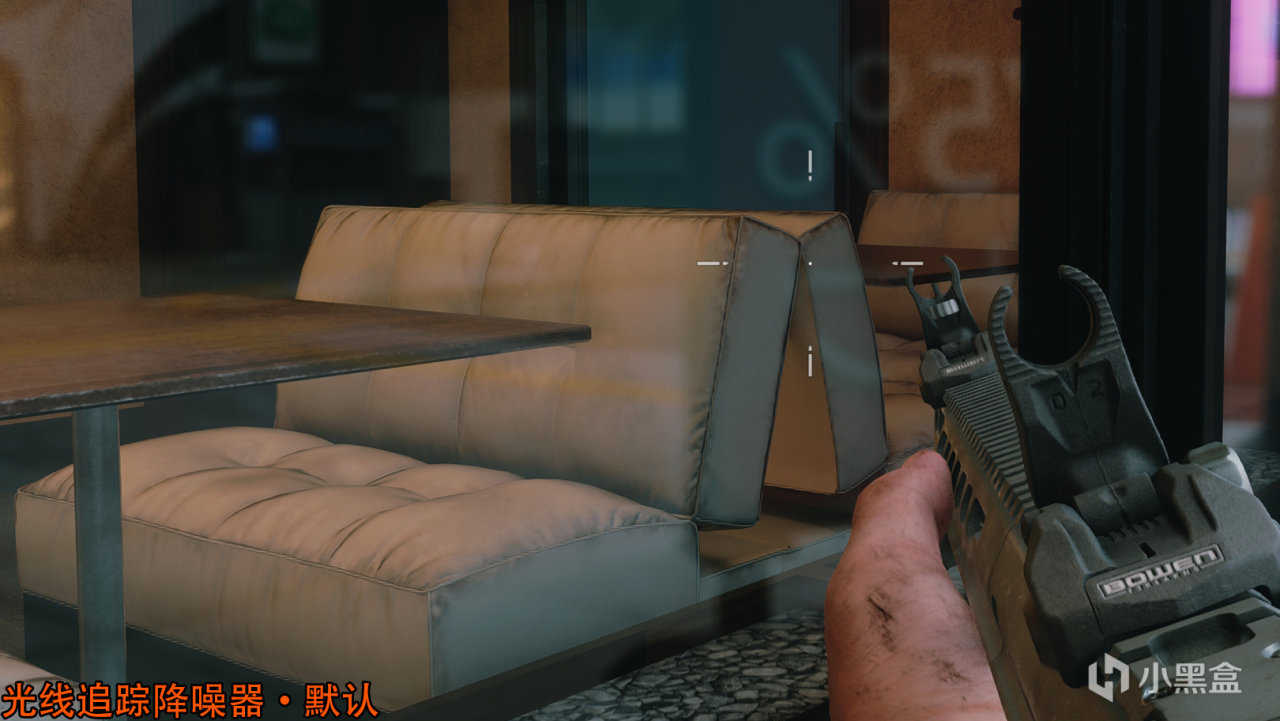傳統降噪器基於算法實現,方式通常較爲直接平滑,處理過的噪點區域要不損失細節,要不只處理一部分。在上述直視金屬窗框被頂燈直射的畫面中,默認降噪只能淺淺處理一部分,這樣做可以避免金屬材質和噪點一併去除,導致頂燈直射效果只能呈現一部分畫面就很假,而FSR光線再生考慮是畫面的光追全局性和細節並存。