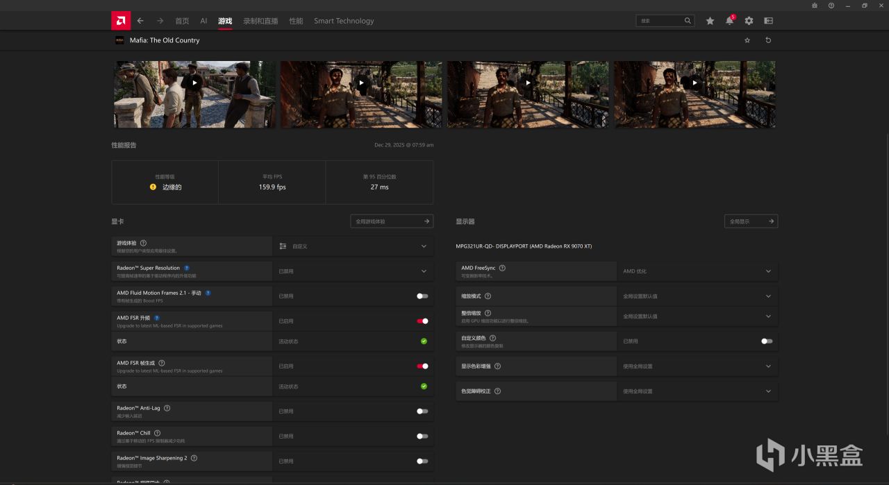 《四海兄弟:故鄉》採用虛幻引擎5打造,對於顯卡性能要求不低,9070 XT在TSR原生情況下只能跑到平均33fps,使用FSR畫質&性能後分別能達到51fps和64fps,個人更推薦性能檔,畫面差別並不是很大,最終疊加基於機器學習的幀生成,相比TSR原生能提升2.8倍。