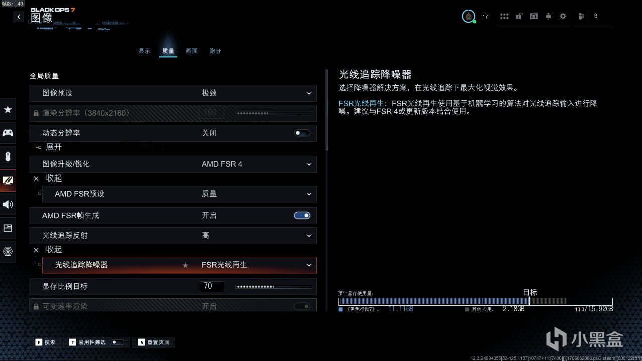 FSR光線再生則是利用AI降噪器,對已有帶有噪點的光追畫面進行修復,以便呈現更逼真的光追和反射細節,目前已在《使命召喚22:黑色行動7》中實裝。