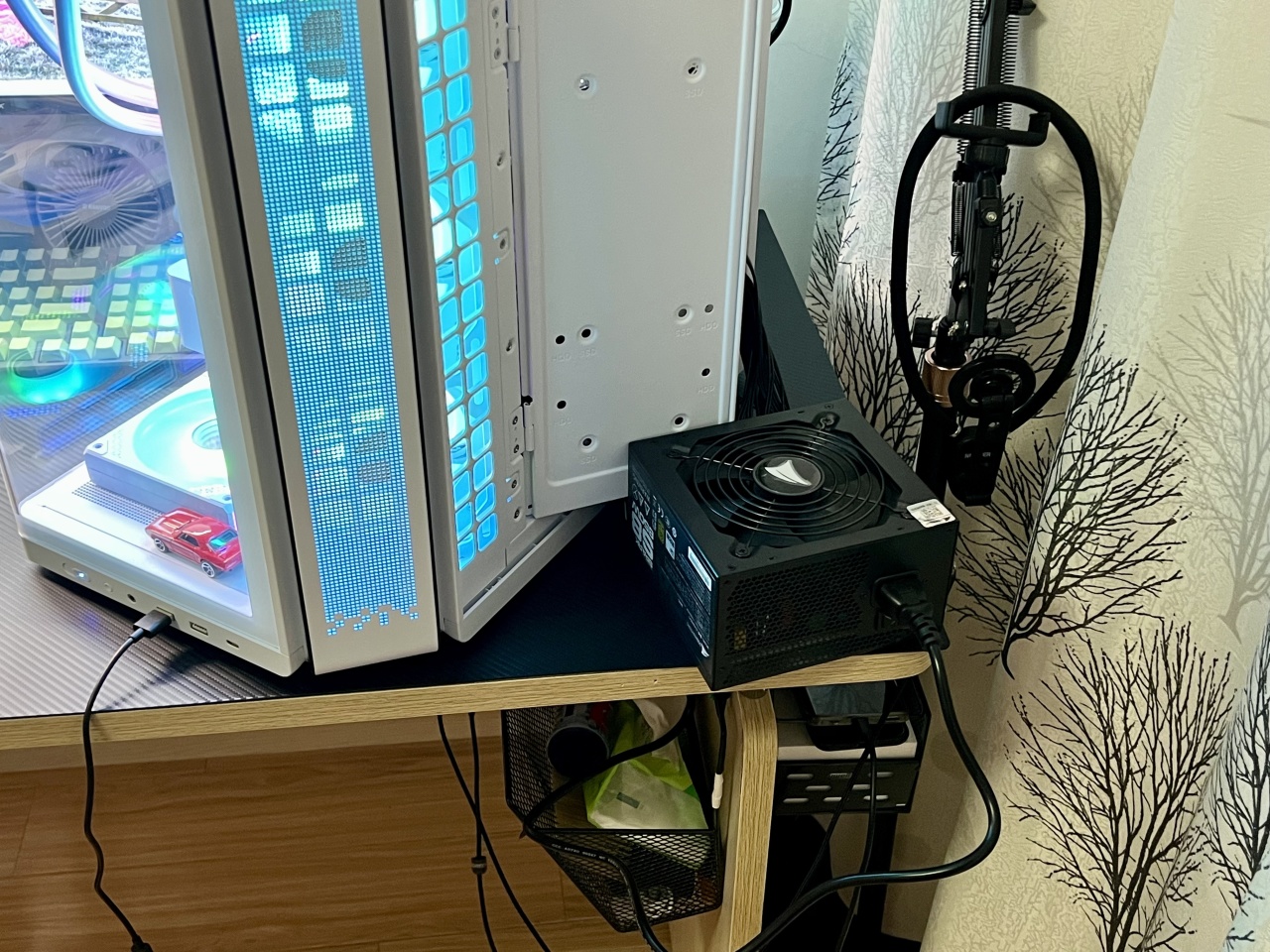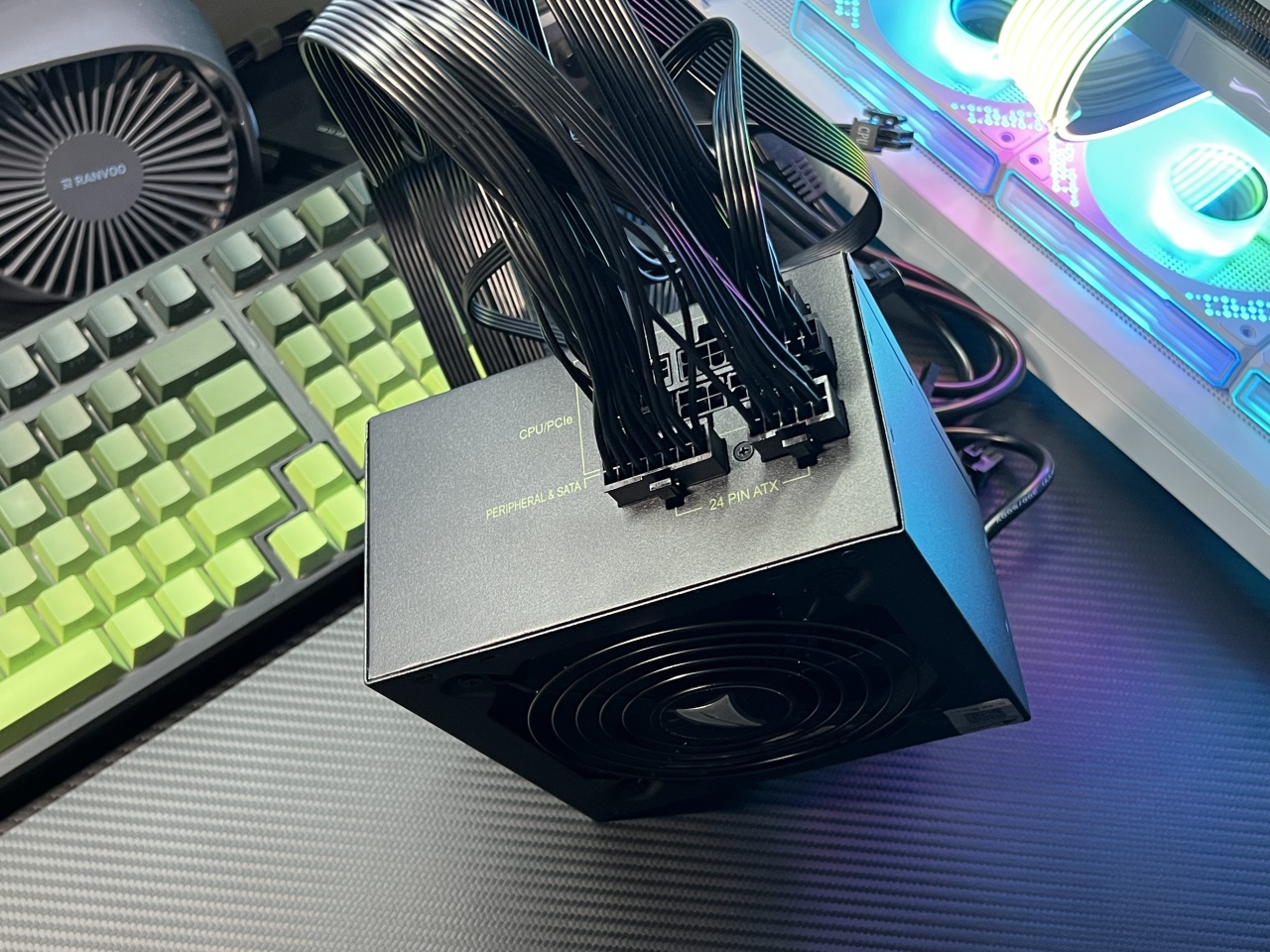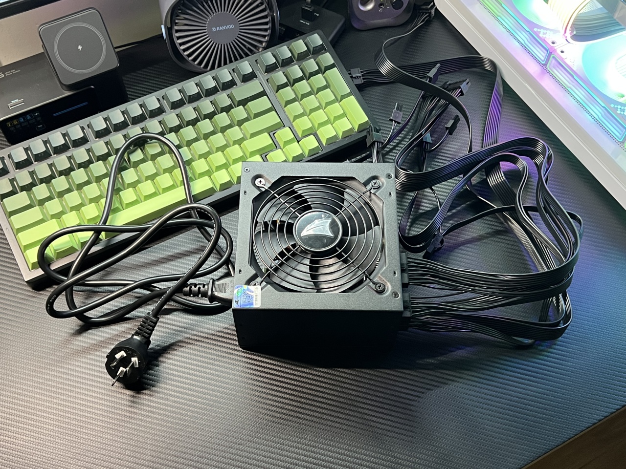 不开应用待机状态下,电源风扇转都不带转;双烤状态下风扇噪声还行,不吵,都还没水冷风扇声音大。