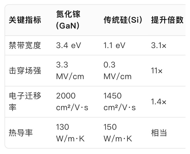 氮化镓较传统硅半导体除了解决方案没硅成熟外,其余各方面已经是全面领先,像关键指标禁带宽度、电子迁移率、毫秒级动态响应等。
