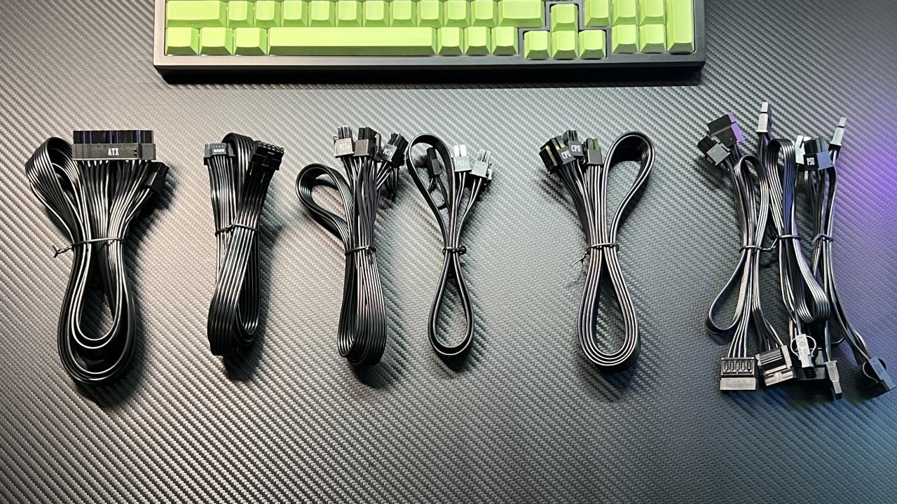 从左到右线材有1根24pin主板线、1根PCIe 5.1 16pin线、1根一拖二8pin PCIe线+1根常规独立PCIe线,1根一拖二的CPU线、 3根6pin SATA+4D线。