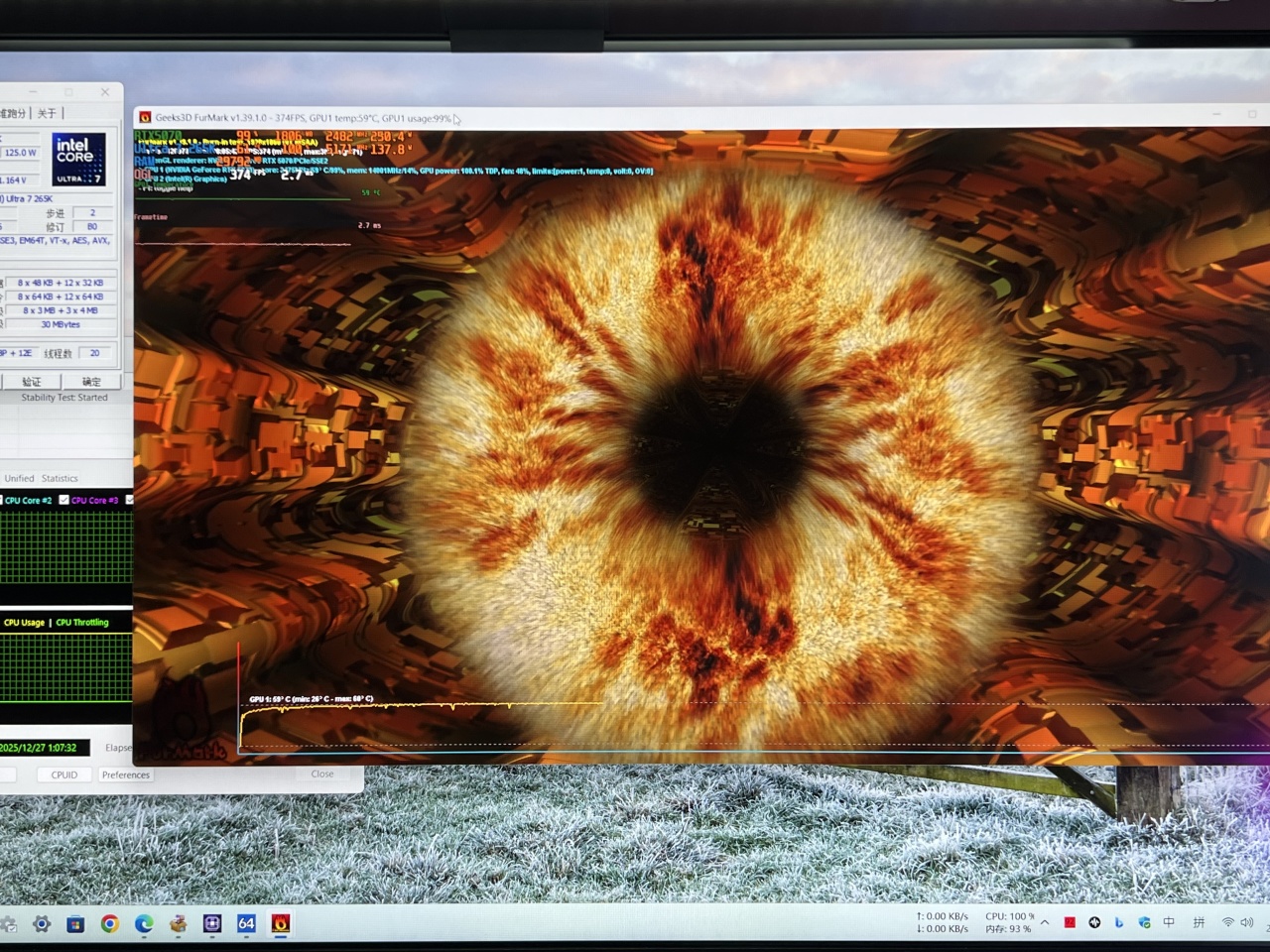 我这边直接把电源外接了,相当于半裸平台。测试平台:Ultra7 265K+华硕Z890大吹雪+西风5070浪花,整机双烤功耗预估在600-680W左右。