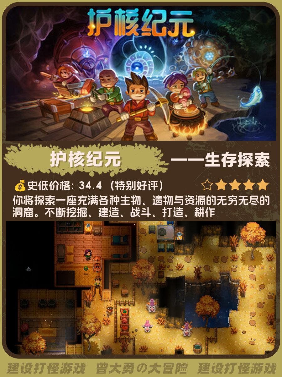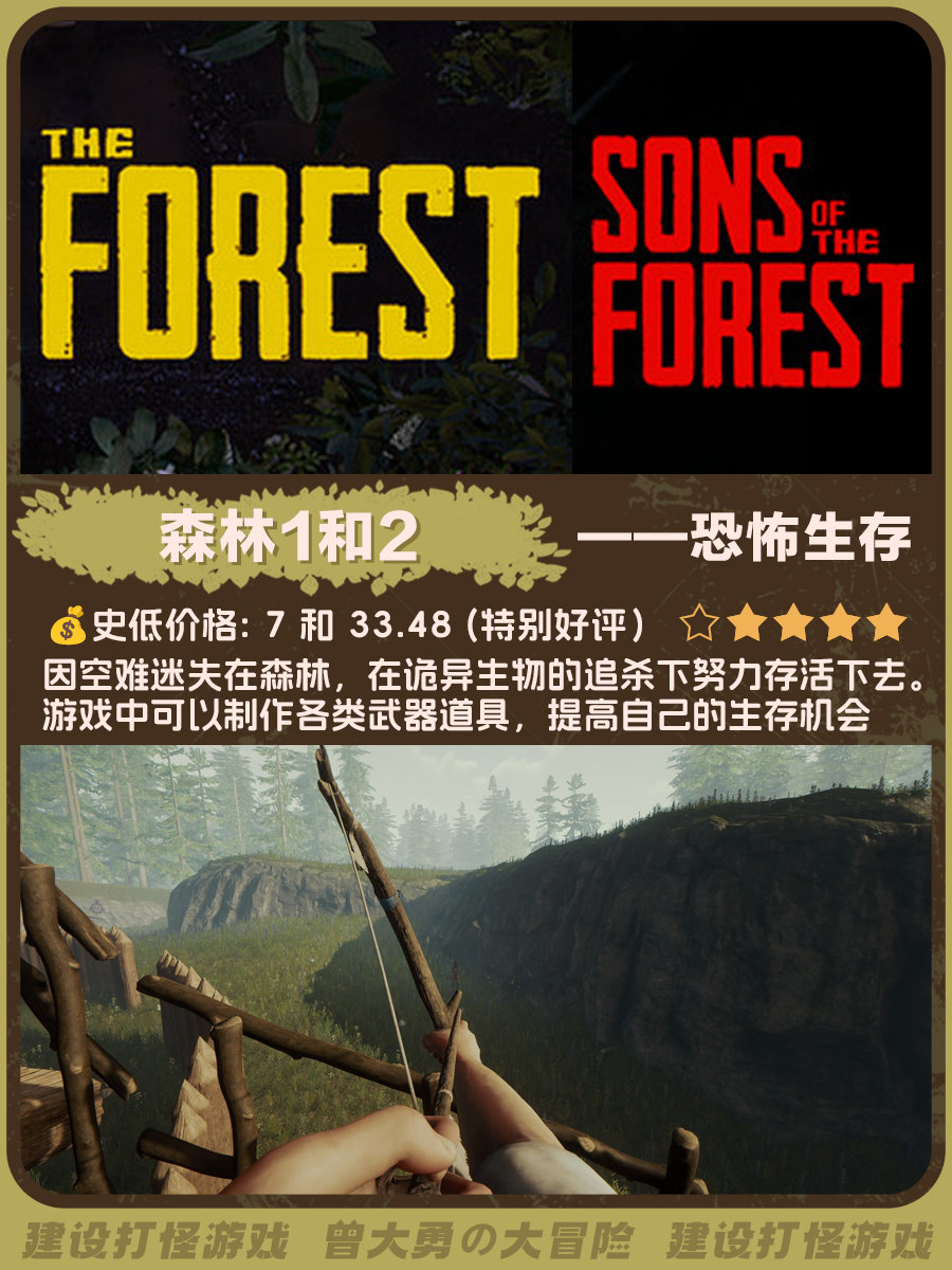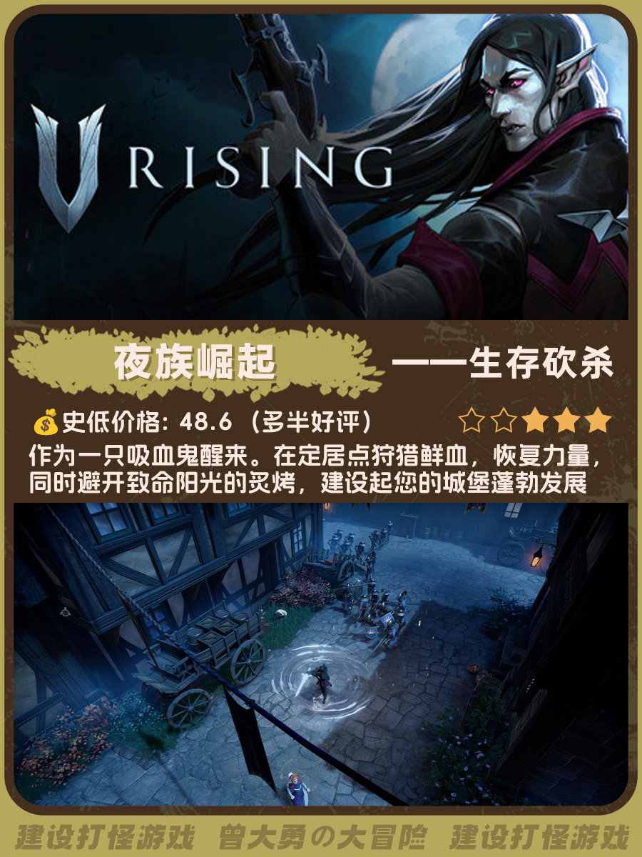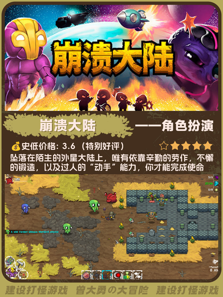 整理了一下还不错的能打怪建造的开放世界游戏。图里包含史低价格、玩家评分、游戏概述,还有饥荒,我的世界、泰拉瑞亚、环世界、七日杀等超多游戏放不下了(星级是根据好评度给出)