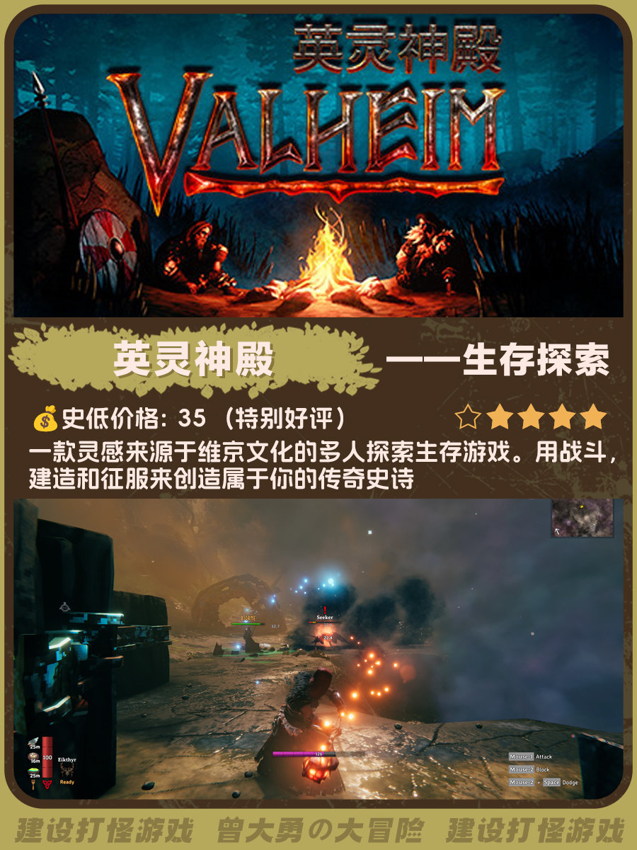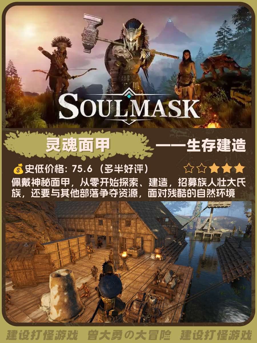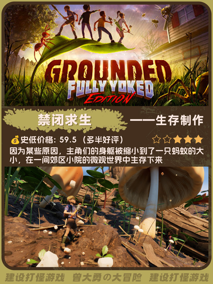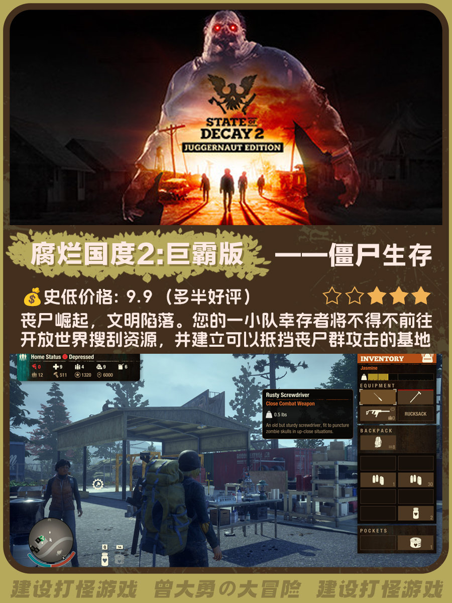 整理了一下还不错的能打怪建造的开放世界游戏。图里包含史低价格、玩家评分、游戏概述,还有饥荒,我的世界、泰拉瑞亚、环世界、七日杀等超多游戏放不下了(星级是根据好评度给出)