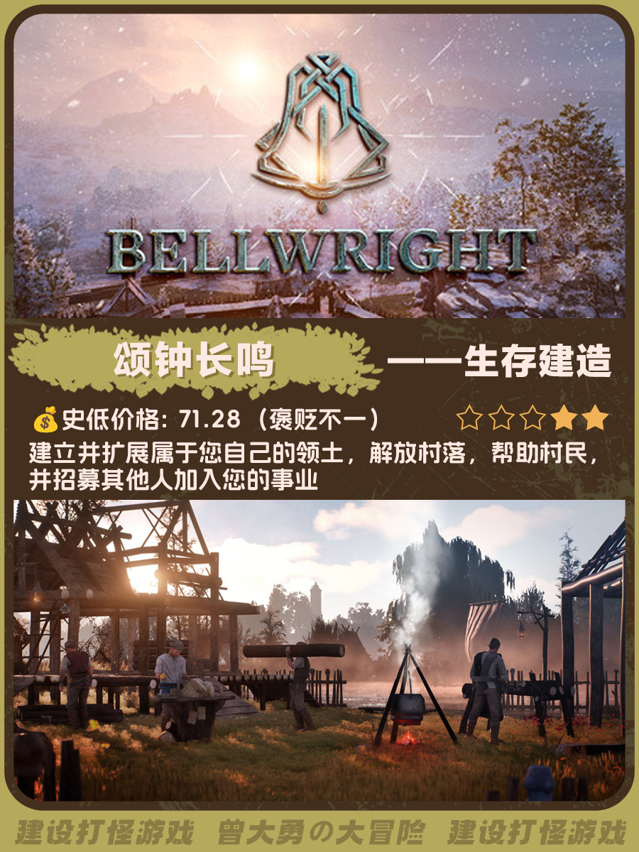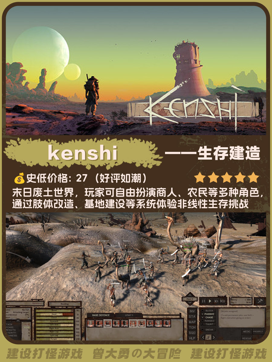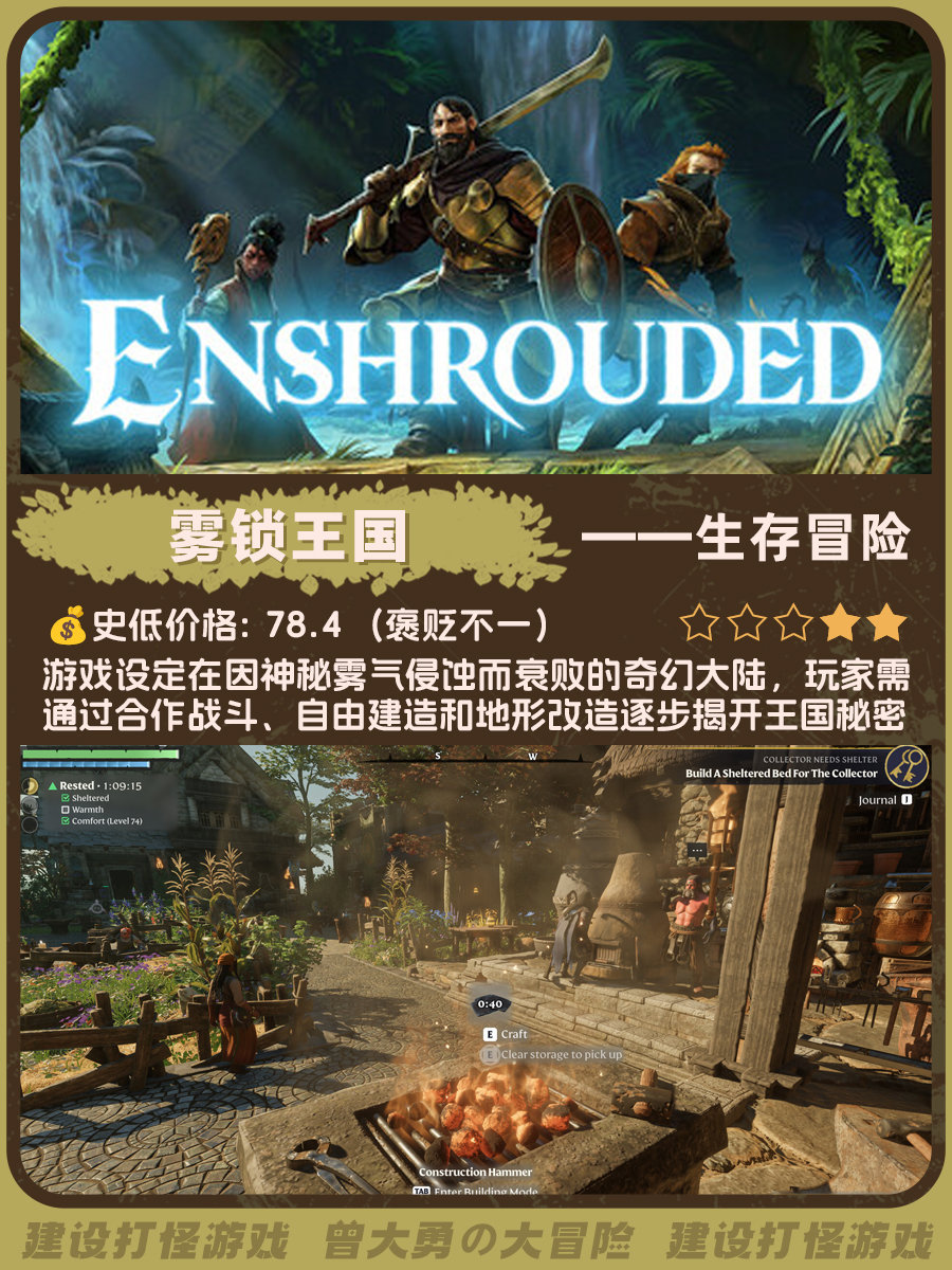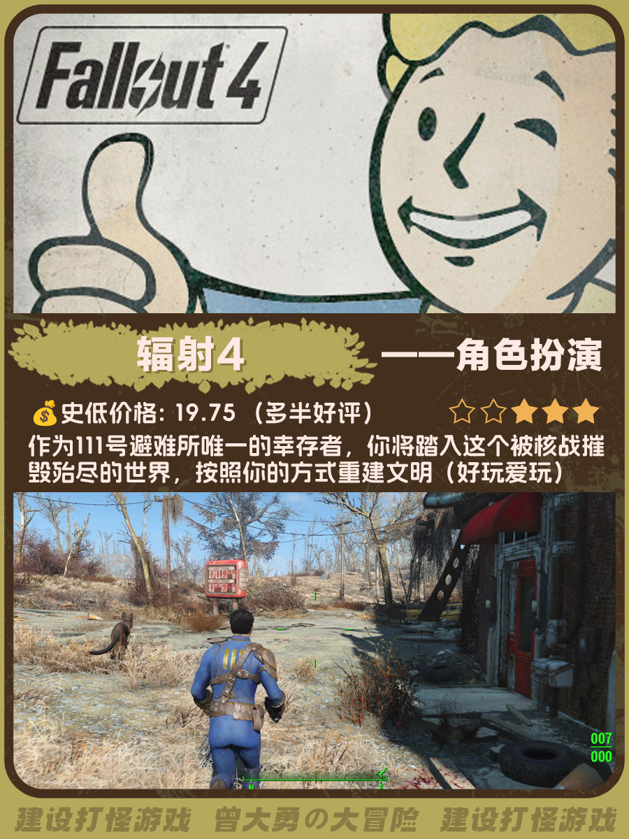 整理了一下还不错的能打怪建造的开放世界游戏。图里包含史低价格、玩家评分、游戏概述,还有饥荒,我的世界、泰拉瑞亚、环世界、七日杀等超多游戏放不下了(星级是根据好评度给出)