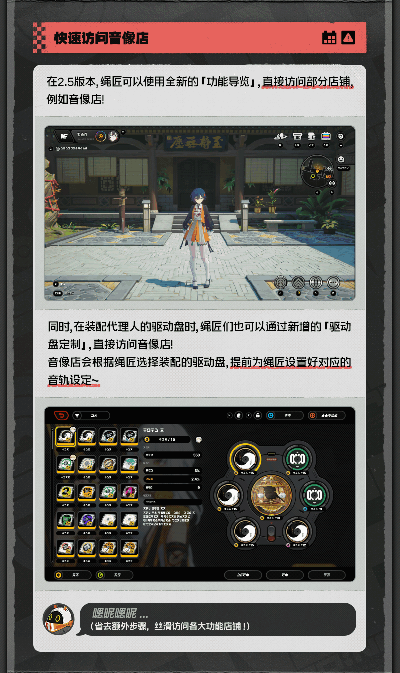 3. 快速访问音像店:通过「功能导览」或装配驱动盘时的「驱动盘定制」,可直接访问音像店,且音像店会根据所选驱动盘提前设置音轨。