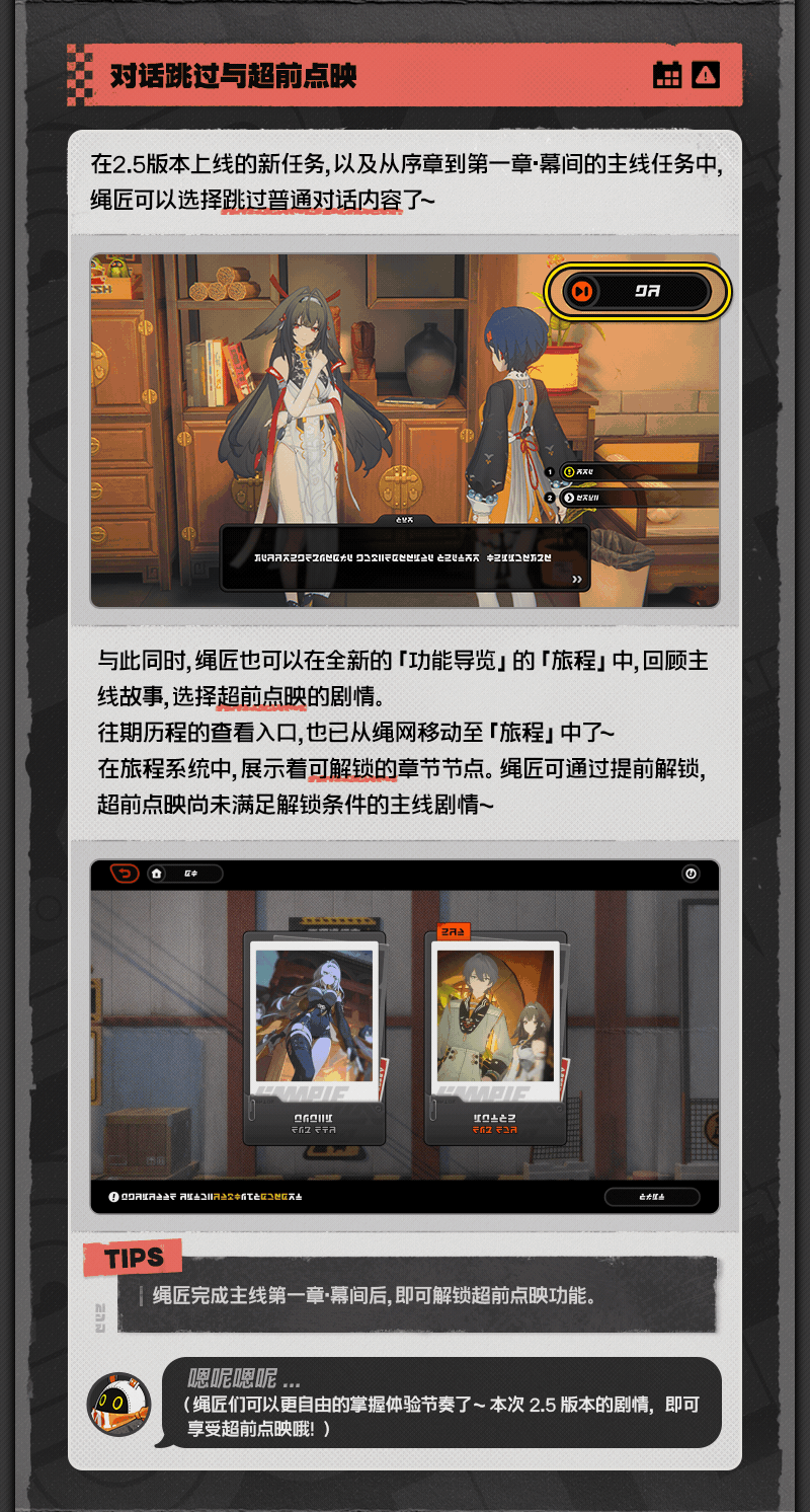 6. 对话跳过与超前点映:新任务及序章到第一章·幕间的主线可跳过普通对话;完成第一章·幕间后解锁「超前点映」,可提前解锁未满足条件的主线剧情,往期历程入口也迁移至「旅程」系统。