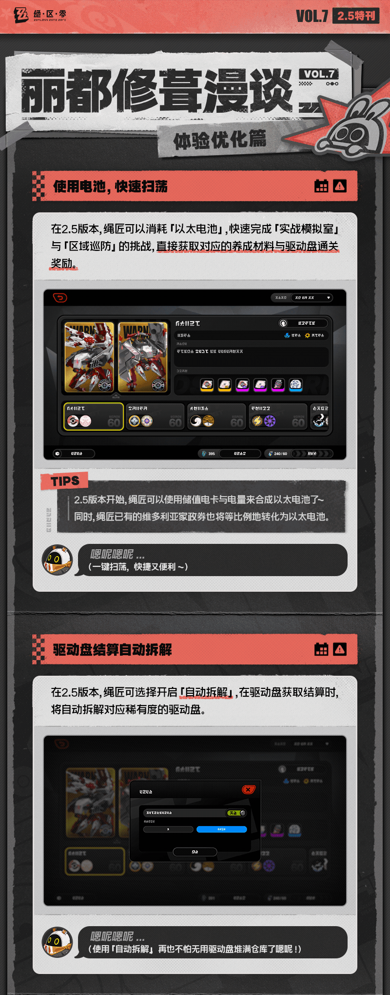 1. 以太电池快速扫荡:消耗「以太电池」可快速完成「实战模拟室」「区域巡防」挑战并获取奖励;储值电卡与电量可合成以太电池,原维多利亚家政券也会等比例转化为以太电池。